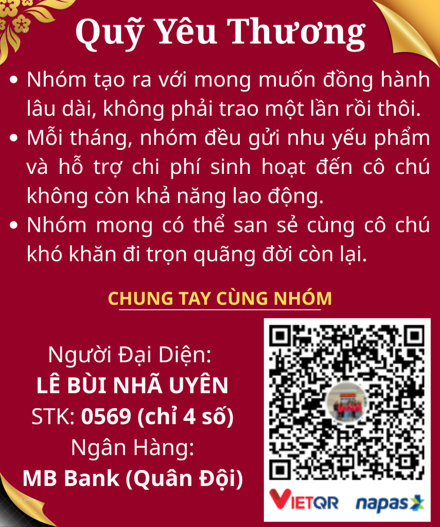 Hàng tháng nhóm sẽ dùng số chi phí này để mua quà bao gồm : gạo, mì tôm, bánh, sữa và 1 ít chi phí gửi đến các cô chú vô gia cư và các hoàn cảnh khó khăn ạ. Anh/Chị hỗ trợ quỹ xin ghi nội dung: Tên Anh/Chị + Ủng Hộ Quỹ Yêu Thương